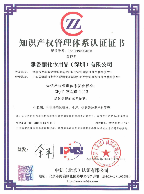 熱烈祝賀雅香麗(深圳)化妝用品有限公司榮獲知識(shí)產(chǎn)權(quán)管理體系認(rèn)證證書(shū)