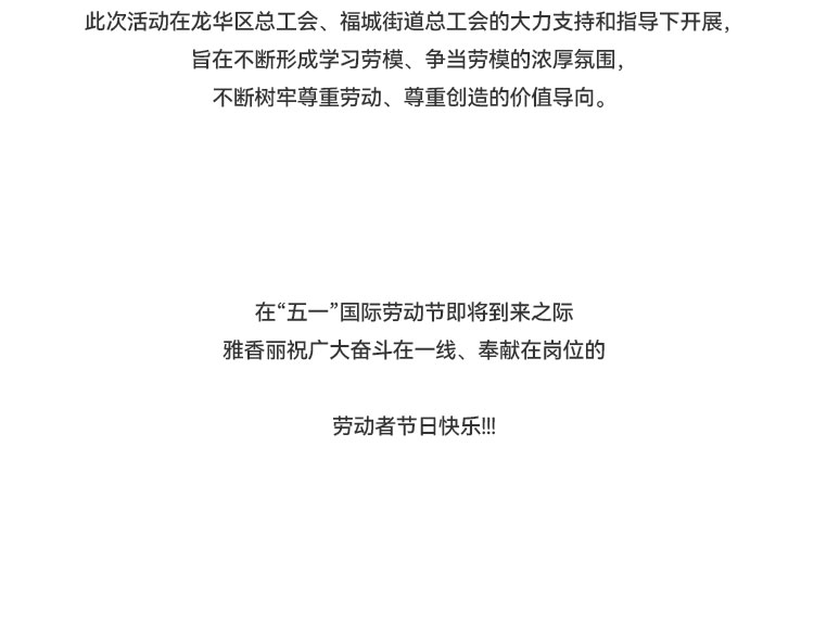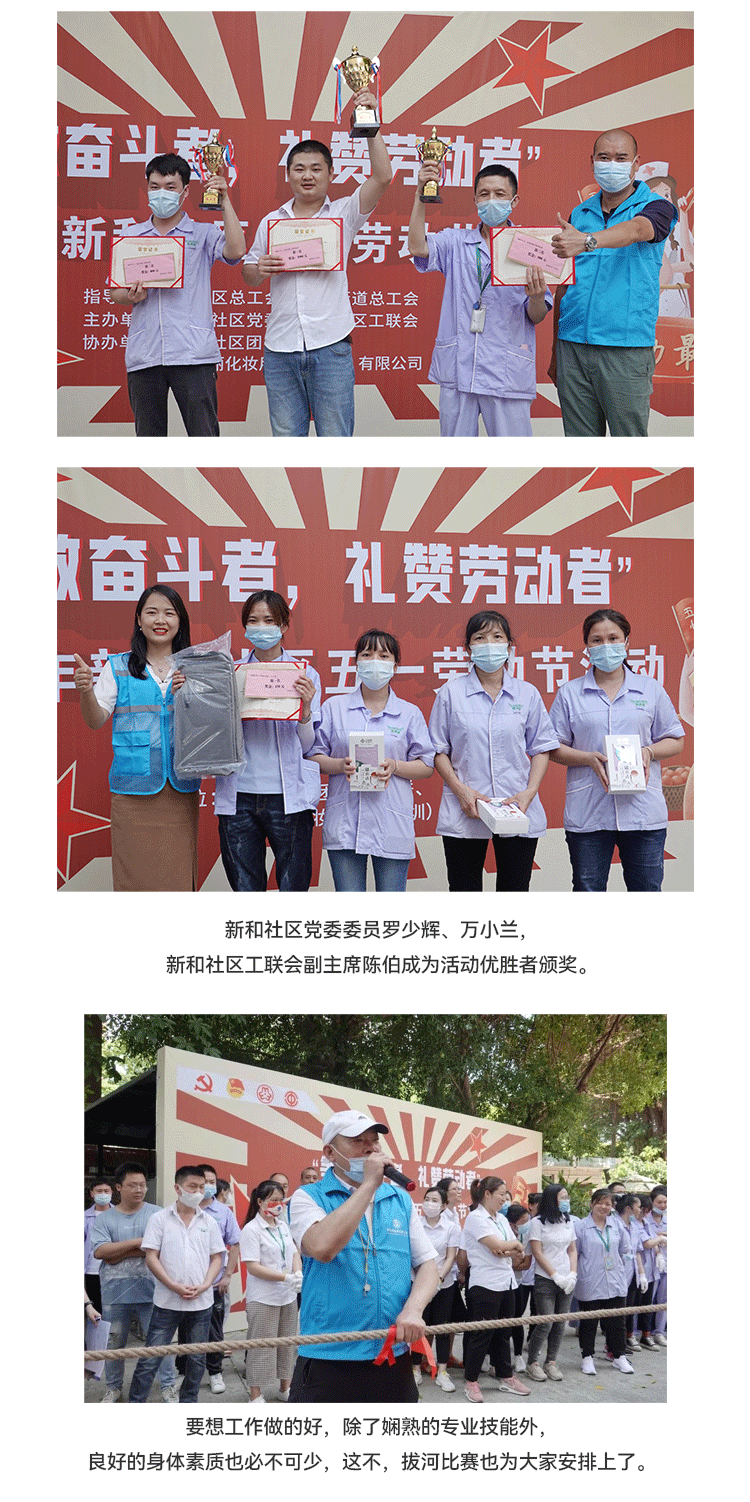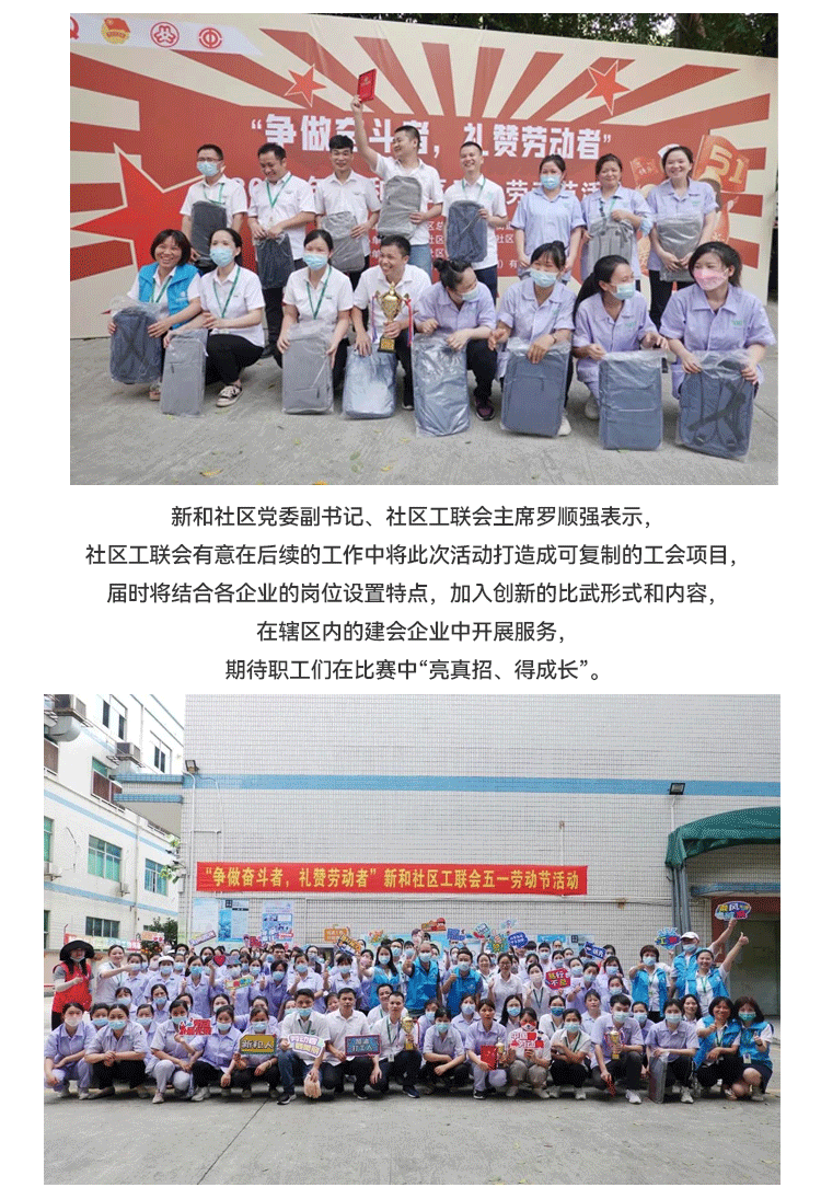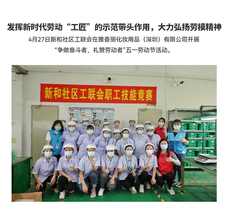 發(fā)揮新時代勞動"工匠"的示范帶頭作用,大力弘揚勞模精神;新和社區(qū)工聯(lián)會在雅香麗化妝用品(深圳)有限公司開展 “爭做奮斗者,禮贊勞動者”五一勞動節(jié)活動。